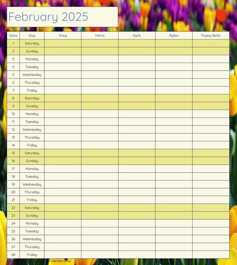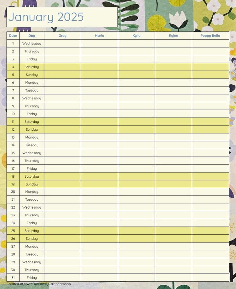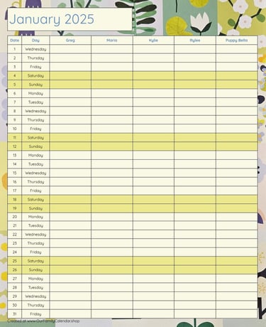 Create a personalized calendar with one column for each family member, even including your pet(s) ... and specify the names to be displayed at the top of each column.